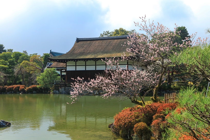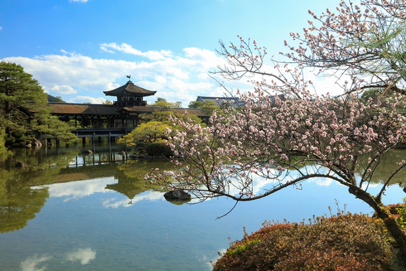 創建から130年を記念した、大極殿の改修工事を終えたばかりの平安神宮。紅しだれ桜のイメージが先行しますが、例年3月上旬から中旬にかけて東神苑の池畔で梅が咲くのをご存知でしょうか。