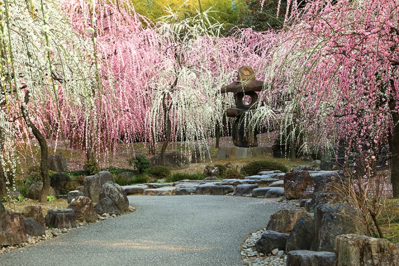 小野小町ゆかりの隨心院は、梅の名所としても有名です。約230本の梅が咲き誇る「小野梅園」は、毎年3月初旬から2週間ほど開園。はねず色(薄紅色)の花が咲く「はねず梅」が美しく、見頃は例年3月初旬から下旬にかけて。他に比べ見頃の時季は遅く、“フィナーレを飾る梅名所”となっています。3月の最終日曜日には「はねず踊り」を開催。はねず色の着物に身を包んだ子供たちが、愛らしい舞を披露します。