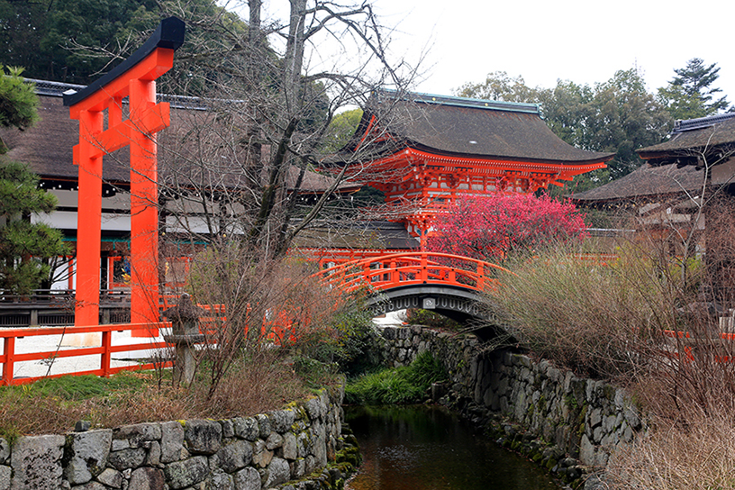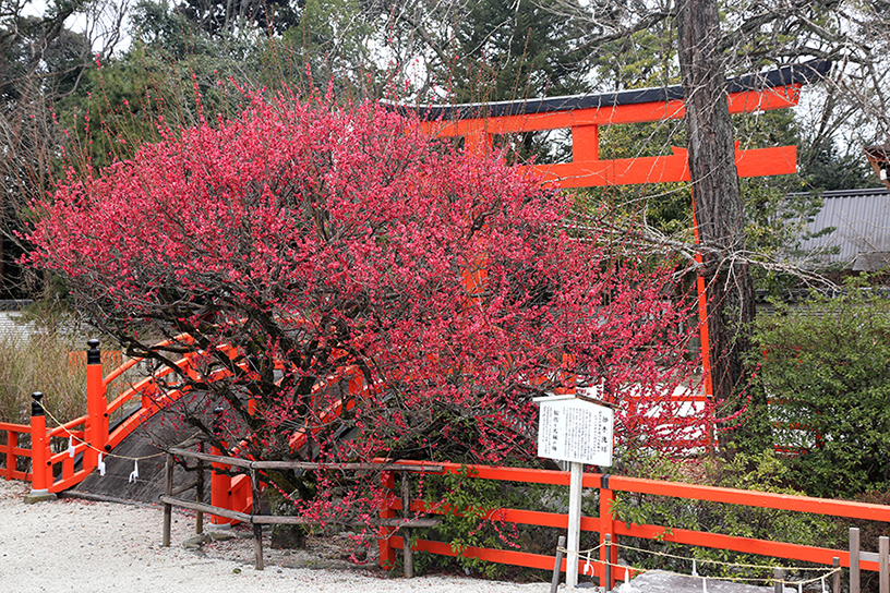 5月に行われる「葵祭」でも有名な下鴨神社で、たった1本ながら、多くの参拝者を魅了するのが“光琳(こうりん)の梅”。見頃となる3月上旬は、鮮やかな鳥居や社殿にも負けず劣らずの存在感と馥郁(ふくいく)とした香りを放ちます。