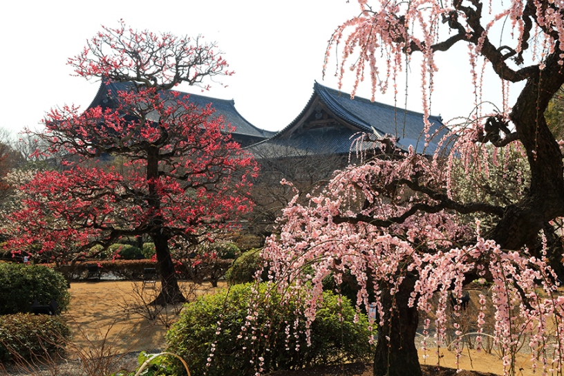 今年は、いわゆる“寛永行幸”から400年の記念の年となり、その舞台として注目が集まる世界遺産・二条城。城内の南西に位置する梅林には、約90本の梅が植わり、例年2月下旬から3月上旬に見頃を迎えます。白梅や紅梅はもちろん、一本の木に紅白の花をつける「源平咲き分け」など、様々な品種があり、長い期間を通して花を愛でることができるのも嬉しいポイント。城壁との組み合わせも絵になります。