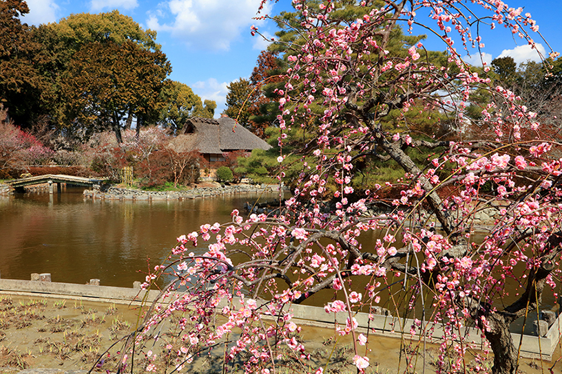 決して本数は多くありませんが、泰平閣(橋殿)や尚美館(貴賓館)を背に咲く様子は、どこか上品で平安時代にタイムスリップしたかのような気分になってしまいます。煌びやかな紅しだれ桜とはひと味違う、優雅な梅風景にもぜひご注目を!