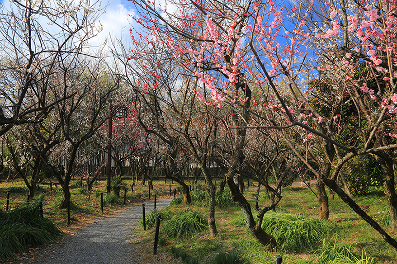 境内の東側に、東山連峰や竹林を背景に咲く約100本からなる梅園を整備。市街地を離れた長閑な雰囲気の中で、のんびりと春の訪れを楽しめます。