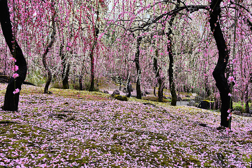 ひと味違った梅を楽しめることで、人気を集めるのが城南宮です。様々な花が咲く神苑のなかでも早春のハイライトとなるのが、“春の山”と呼ばれるエリア。例年、3月上旬には150本ほどのしだれ梅が色鮮やかに咲き誇ります。 満開の時季もさることながら、このお庭で見逃せないのが“散り際”です。花が盛りの時季の雨や風は、何かと心配のタネになりますが・・・