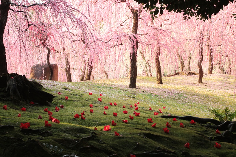 また、今ではすっかり定着したのが、しだれ梅と“落ち椿”です。華やかに咲き誇るしだれ梅を背景に儚げに散る椿の花は、情緒たっぷりですよね。城南宮の神苑に育つ椿は150品種400本ほどを数え、京都でも屈指の名所として知られます。