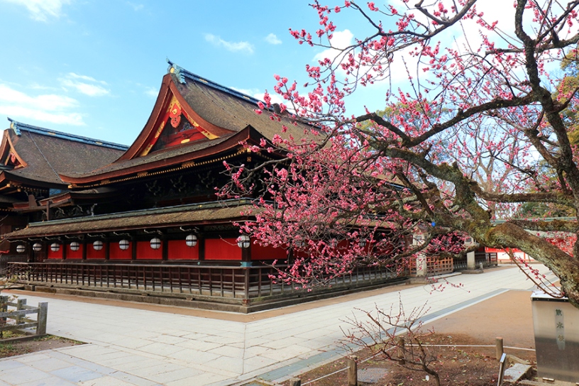 まさにその名があらわすように、境内全域が梅の花で彩られる梅宮大社。意外にも、見頃を迎える2月上旬以降も境内は静けさを保ち、「のんびりと梅を楽しみたい」という方におすすめしたいスポットです。市街地から離れていることもあって、空が広く開けており、背伸びしたくなるほどの開放感はこの神社ならでは♪