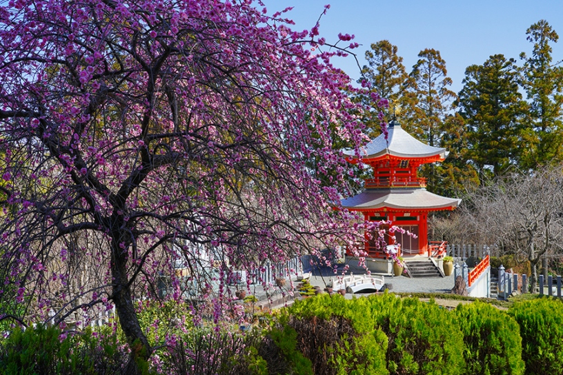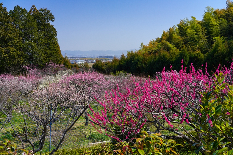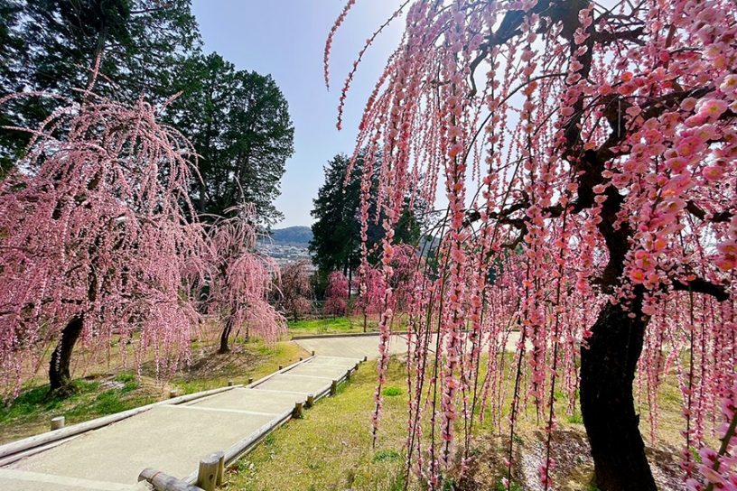 境内の東側に、東山連峰や竹林を背景に咲く約100本からなる梅園を整備。市街地を離れた長閑な雰囲気の中で、のんびりと春の訪れを楽しめます。