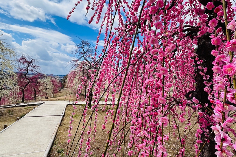決して本数は多くありませんが、泰平閣(橋殿)や尚美館(貴賓館)を背に咲く様子は、どこか上品で平安時代にタイムスリップしたかのような気分になってしまいます。煌びやかな紅しだれ桜とはひと味違う、優雅な梅風景にもぜひご注目を!