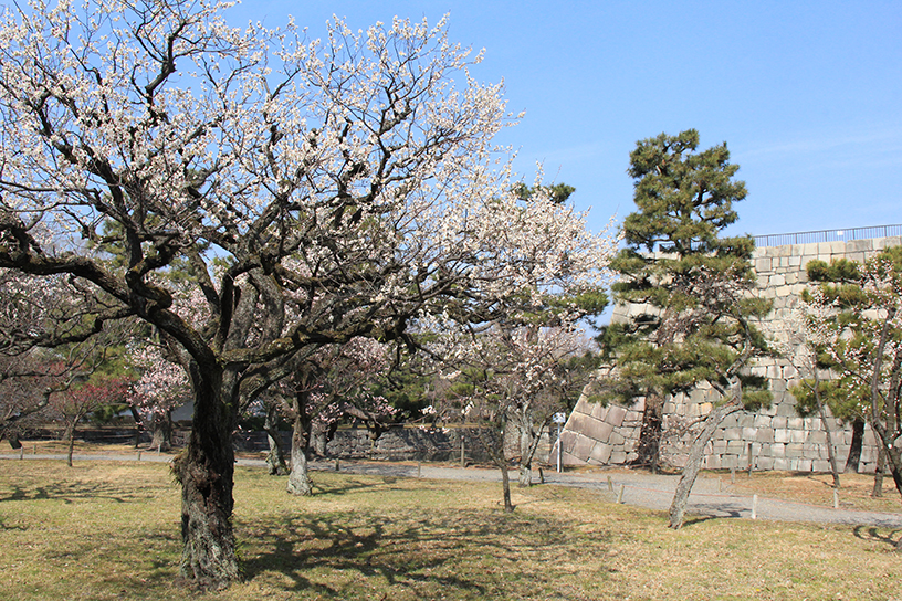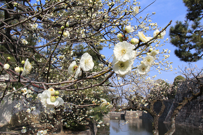今年は、いわゆる“寛永行幸”から400年の記念の年となり、その舞台として注目が集まる世界遺産・二条城。城内の南西に位置する梅林には、約90本の梅が植わり、例年2月下旬から3月上旬に見頃を迎えます。白梅や紅梅はもちろん、一本の木に紅白の花をつける「源平咲き分け」など、様々な品種があり、長い期間を通して花を愛でることができるのも嬉しいポイント。城壁との組み合わせも絵になります。