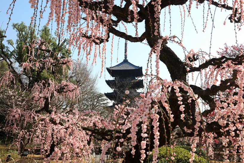 本数にして約15本、決して数は多くありませんが、一本一本が大きく、そして印象的な枝ぶりをしているが特徴的です。そして何と言っても嬉しいのが、“写真映え”すること。五重塔と梅が織りなす光景は、「いかにも京都」な花景色。早春の京都を代表するお花見スポットとして、徐々に人気となっています。