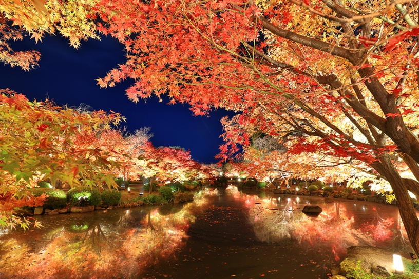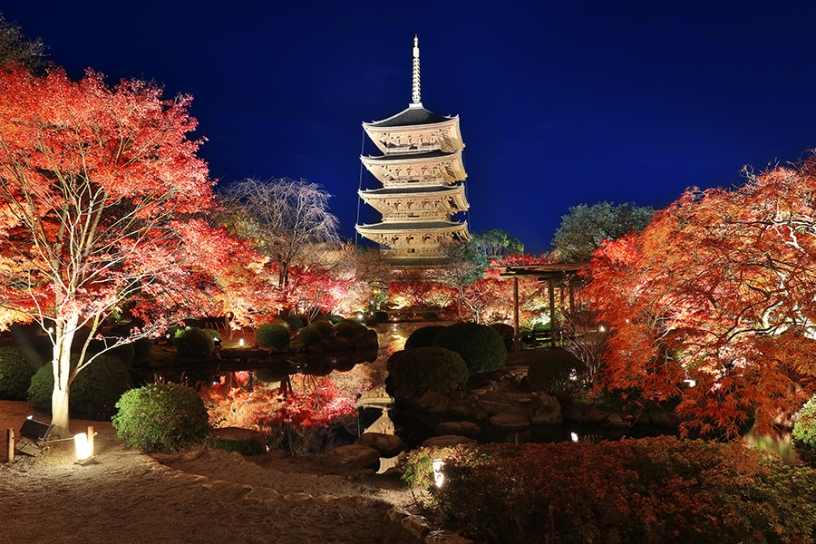 世界遺産・東寺は、京都駅から徒歩圏内という立地で、旅の最後まで紅葉を楽しみたい方にもおすすめ。五重塔(国宝)とライトアップされた紅葉は「これぞ、京都!」という絶景で、池にリフレクションする紅葉も綺麗です。金堂と講堂では、国宝・重文に指定された貴重な仏像にお参りできます。拝観時間は21時30分までと長く、混雑を避けるなら遅めの時間に訪ねましょう。一方、一般入場に先駆けて、17時10分から拝観できる「東寺 夜間特別拝観先行入場」(要事前申込み)も登場しています。