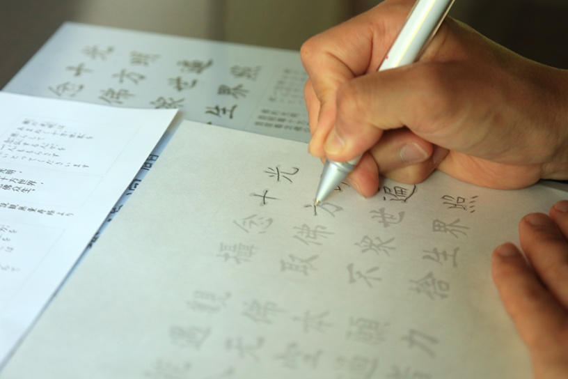 “机の部屋”のお隣には写経スペースがあり、玄関で受け取った“写経セット”の出番となります。こちらはボールペンでなぞるタイプの写経。普段なかなか体験する機会もないので、思い出の1つにもなりそうですよね。ボールペンはセットの中に入っていますので、気軽にチャレンジできます♪ 書き終わったら写経紙を持って、1階に下りましょう。