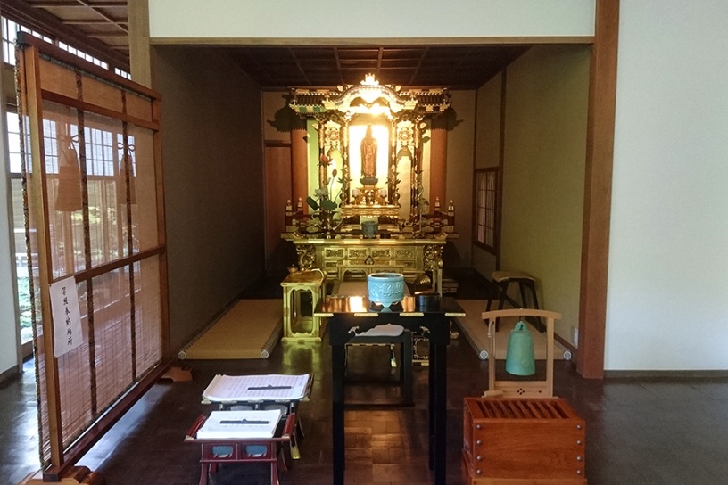 瑠璃の庭を堪能したら次のお部屋へ。瑠璃光院のご本尊・阿弥陀如来像が祀られている本堂です。しっかりと手を合わせてお参りしましょう。そして2階で書き終えた写経はこちらに納めることができます。