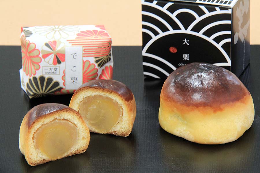 この秋注目が集まる「酬恩庵(しゅうおんあん) 一休寺」の最寄り駅・近鉄京都線「新田辺駅」の近くにある和菓子店、一方堂。味はもちろん、パッケージも魅力的です。看板商品の「でこ栗」は、秋の味覚・栗が丸ごと入ったおまんじゅうで、素朴な味わいに思わず頬が緩みます。袋には華やかな菊紋がデザインされていて、赤・黒・金の3色がパッと華やか。黒いスタイリッシュな箱に入った「大栗」は、でこ栗よりも大きな栗が入っているので、栗好きさんは要チェックです!