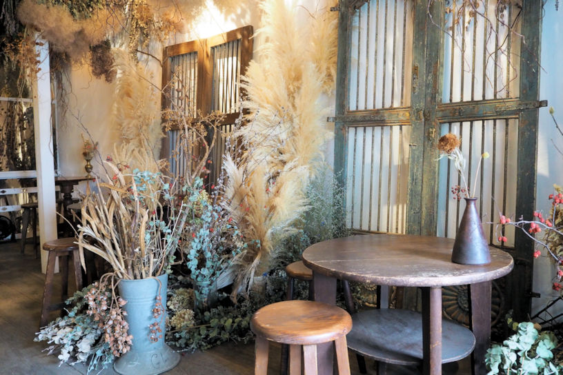 2階はドライフラワーに包まれたカフェ