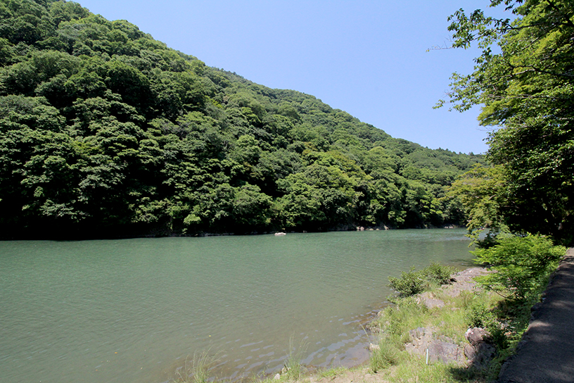 渡月橋から大堰川の上流へ。翡翠色の美しい川沿いを7分ほど歩いた先に祐斎亭はあります。道中、人気のコーヒースタンド・アラビカ京都 嵐山や福田美術館があり、立ち寄ってみるのもおすすめです。