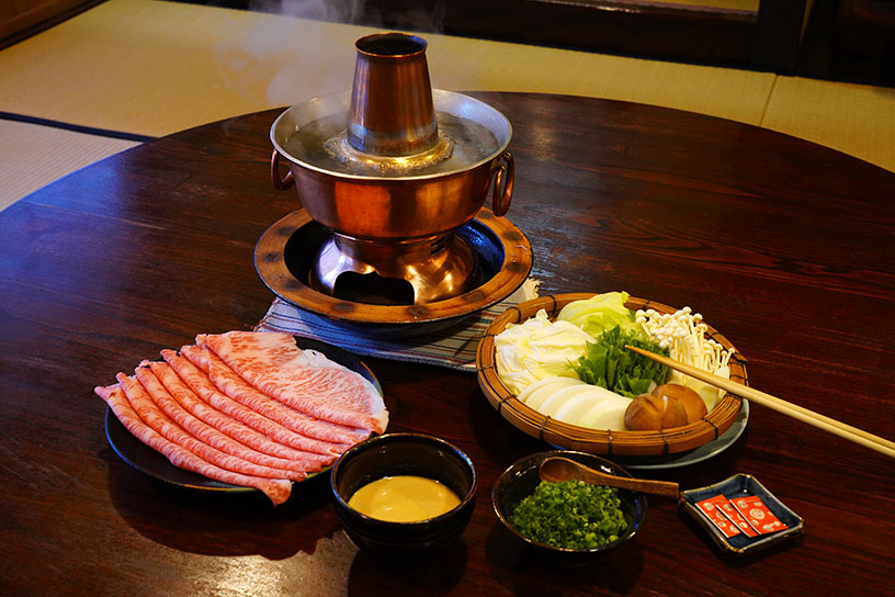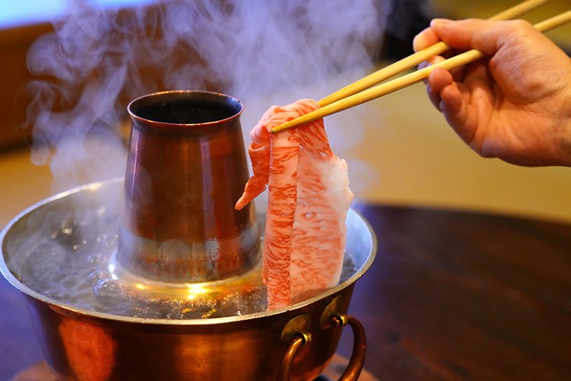 きっかけになったのが中国の石鍋「火鍋子(ほうこうず)」でした。二代目は用途を詳しく知らずにお店に飾っていたところ、民藝運動家の吉田璋也が薄くスライスした羊の肉を煮るための中国の鍋だと教えてくれたのだといいます。それにヒントを得て、京都で肉といえば牛肉というのもあり、牛肉の水炊き、いわゆるしゃぶしゃぶを考案するにいたったそうです。