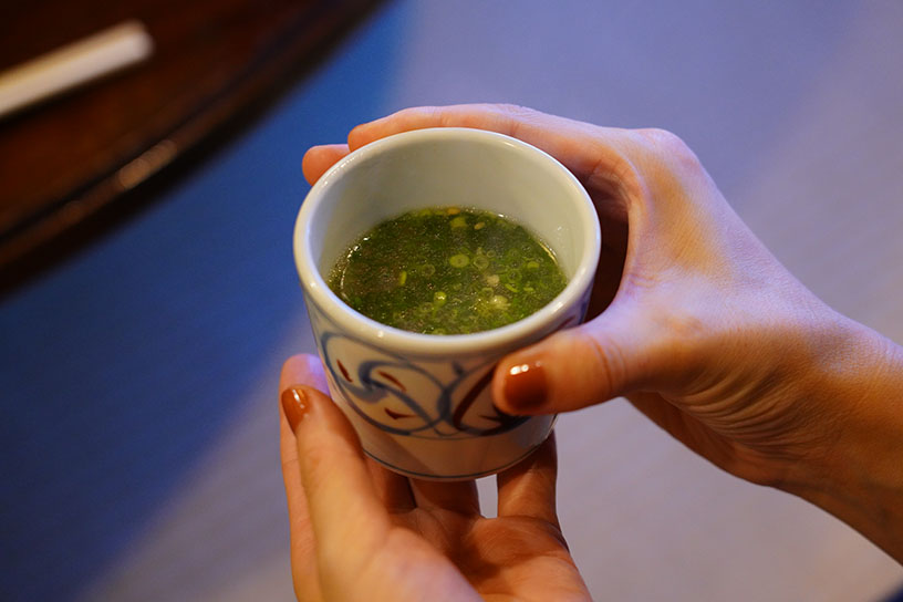 お鍋の締めにはスープを。特注のお鍋は熱伝導率が良く、アクがほとんど出ないため、なんと、しゃぶしゃぶ後のお出汁をスープとしていただけます。お肉や野菜の旨味が凝縮された味は間違いがありません。