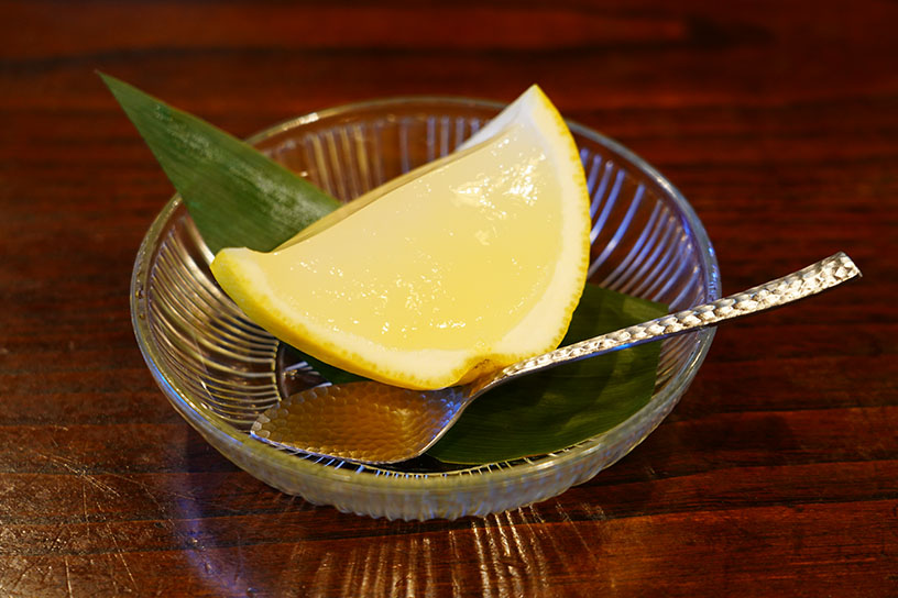 デザートは冬を除き一年通してグレープフルーツゼリーをいただけます。ご当代が修行先で学んだレシピで、ゼリーの状態をギリギリ保ったフルフル食感がたまりません。白ワイン入りのさわやかな味に、最後の最後まで幸福感いっぱいのお食事でした。