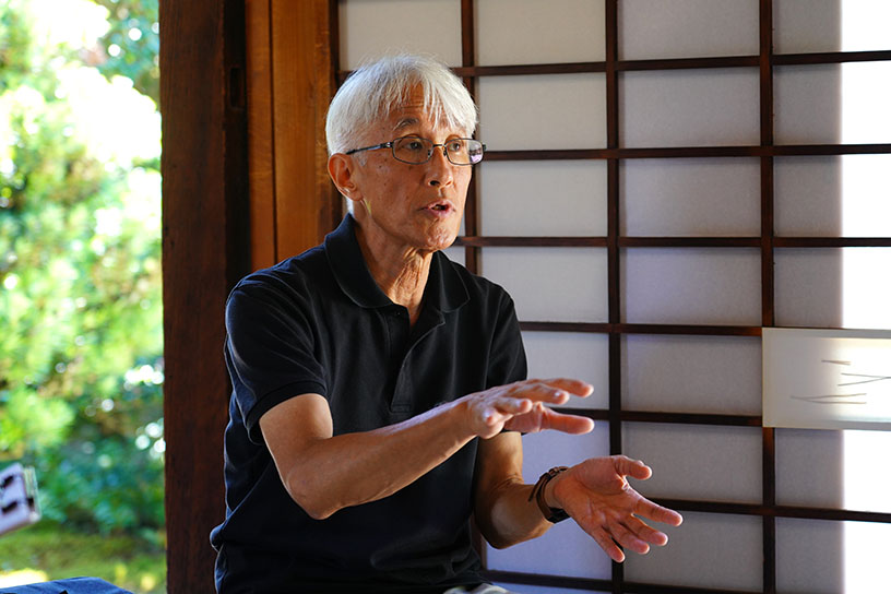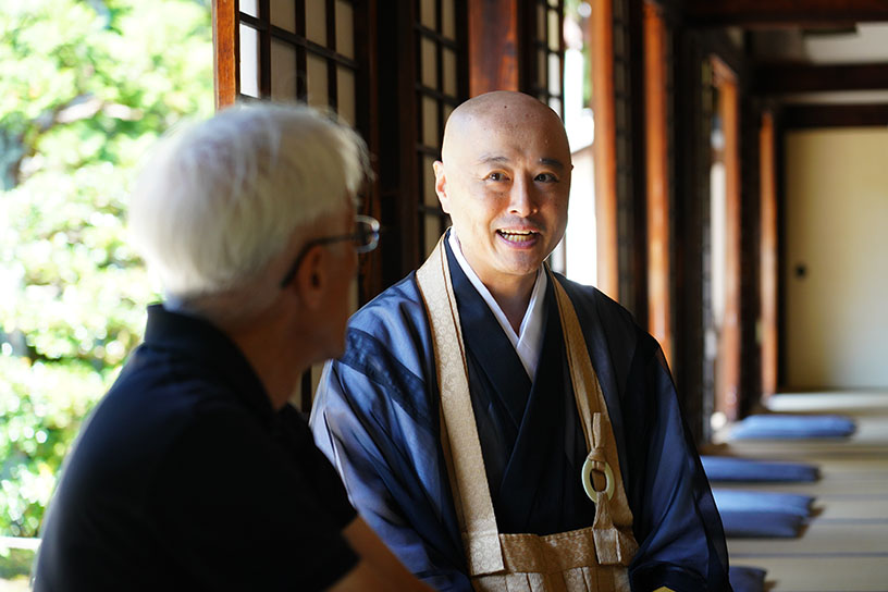 お寺を訪ねると、ご住職の爾法孝(その ほうこう)さんが出迎えてくださいました。重森先生とも旧知の間柄で、この日も和やかにお庭談義がスタート。