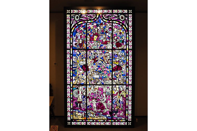 椅子のそばに展示されているのは、印象が昭和30年(1955)に福井県地方裁判所のエントランスホールに飾るために制作したステンドグラス『楽園』。こちらは実物の1/3に縮小したミニチュアです。