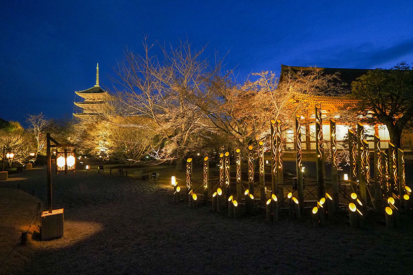 入口へ進むと早速、竹あかりのオブジェがお出迎え。各所に設置された東寺の寺紋入りの照明など、竹ならではの柔らかな雰囲気がお寺によく似合います。