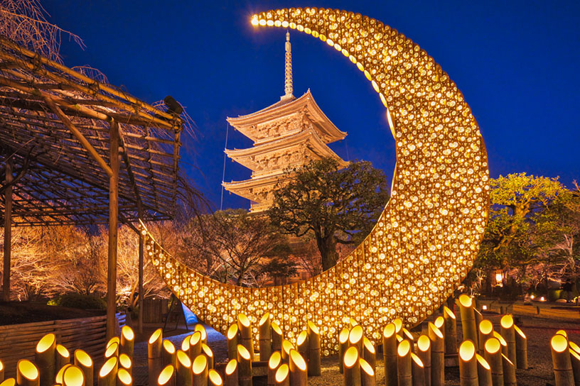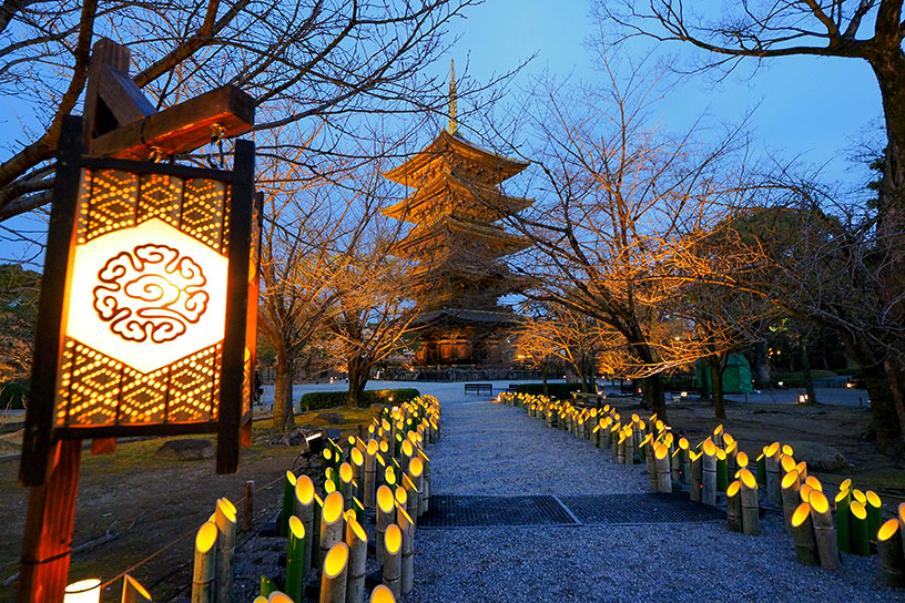 世界遺産の東寺で2月11日(水・祝)から1ヵ月限定のライトアップ「東寺月回廊」が行われています。昨年(2025)10月に好評を博した「嵐山月灯路」の企画スタッフが手掛けるイベントで、数万個の竹あかりが境内を美しく彩ります。早くも話題沸騰中の「東寺月回廊」について、見どころをご紹介しましょう。