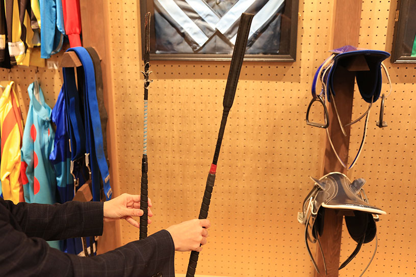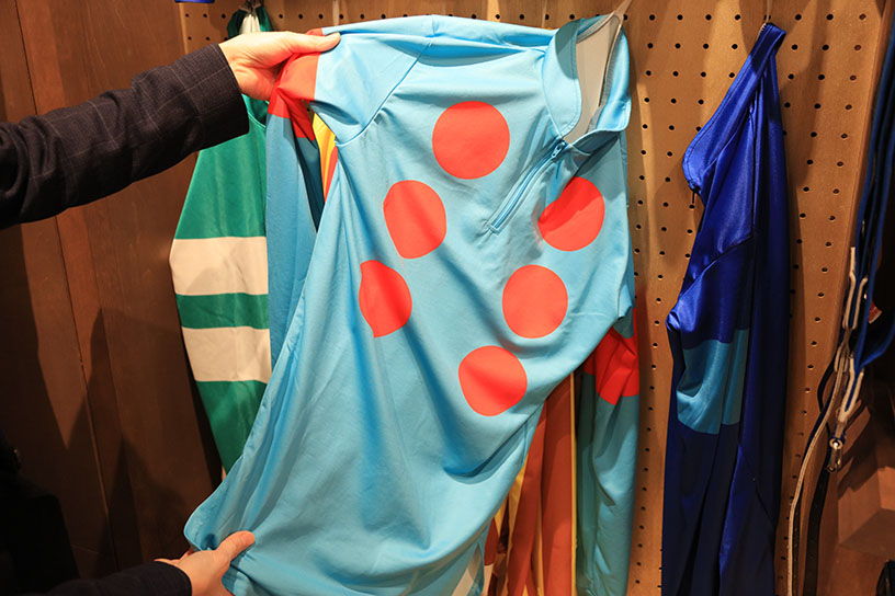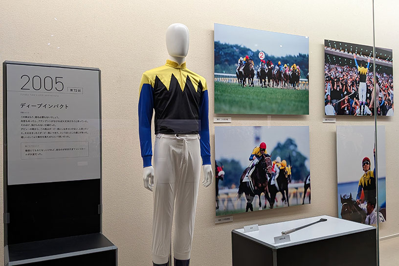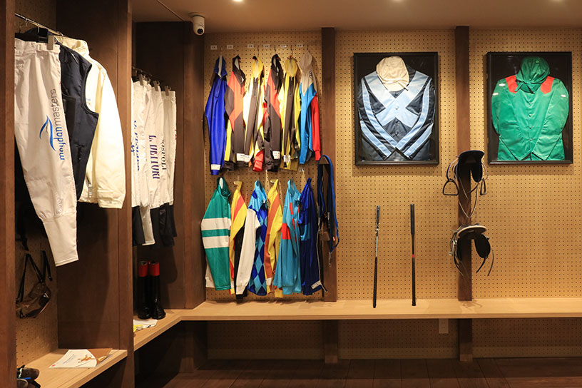 「ジョッキールーム」と名付けられた空間には、他にも実際に使用した勝負服や鞭、鞍などがずらりと展示されています。コレクションはルメール騎手以外の方々にも寄贈していただいているそうです。