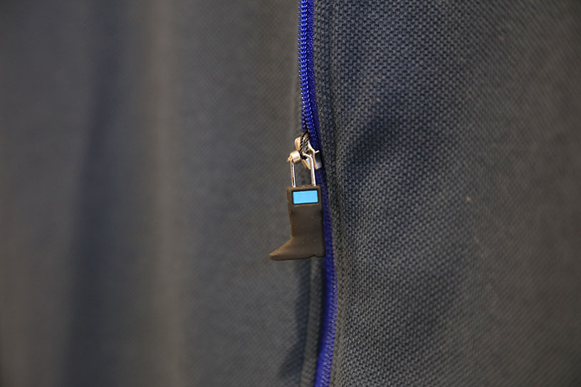 細部へのこだわりも。ポロシャツのボタンはヘルメット型に、ジッパータイプの服にはジョッキーブーツがワンポイントで付けられています。