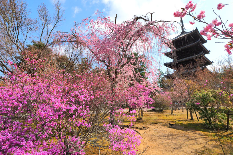 近年、仁和寺では献木によってミツバツツジが増えつつあるのをご存じでしょうか。ちょうど御室桜の開花時季と重なり、いっそう華やかに感じられます。
