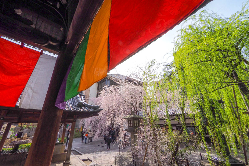 用明天皇2年(587)、聖徳太子によって創建されたと伝わる六角堂はしだれ桜が圧巻。六角形のお堂に降り注ぐように「御幸桜(みゆきざくら)」が咲き、春は笑顔で空を見上げる拝観者で賑わいます。