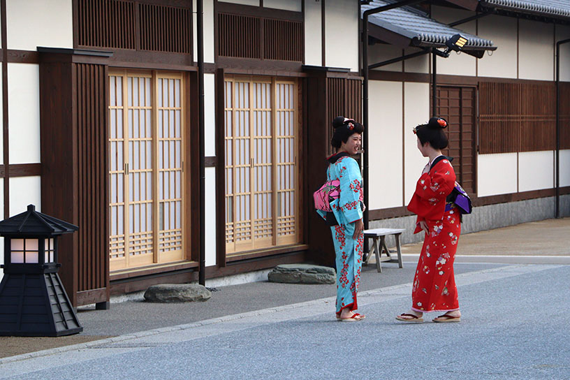 せっかくなら、自分自身も江戸時代にタイムトラベルした気分を味わってみてはいかがでしょう。本格的な時代扮装や着物レンタルはもちろん、お手軽に頭だけを舞妓さんや侍に変身できる手ぬぐいもあります。リアルな風景に溶け込み、時代劇の登場人物のように役になりきって没入できるのも、映画村ならではの醍醐味です。