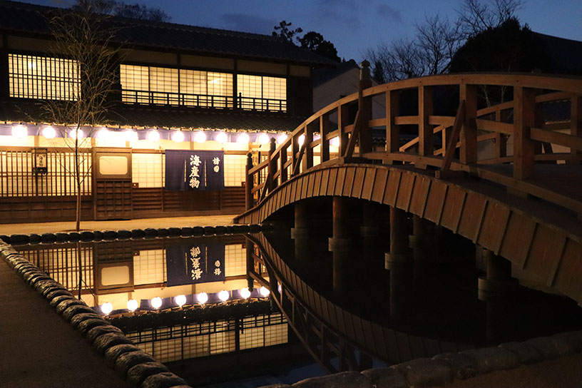 リニューアルに伴い、営業時間は21時まで延長されました。提灯に明かりが灯ると、江戸時代の街並みはいっそう幻想的に。