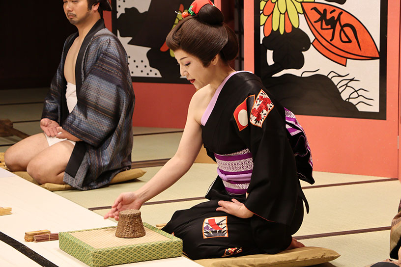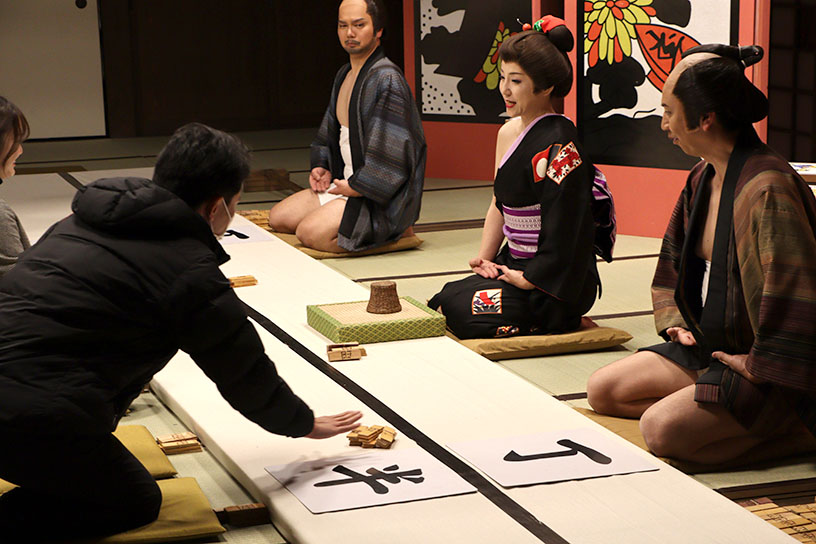 ひとつめは、江戸時代の賭博場を再現した「丁半博打」。気風の良い姐さんの仕切りで、参加者はサイコロの目を予想します。「丁か半か…!」、賭けが進むほどに熱気を帯びる様子は時代劇で見たシーンさながら。もちろん、お金は賭けていませんので安心して遊びましょう♪