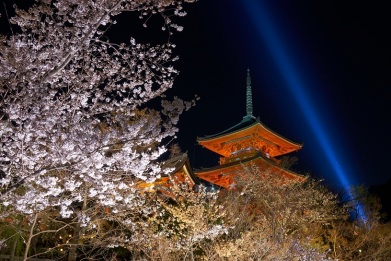 “観音様の慈悲”を表す青い一筋の光が輝く、清水寺の春の夜。幻想的にライトアップされる清水の舞台や三重塔、そして舞台から見える京都の夜景が、春の夜を彩ります。