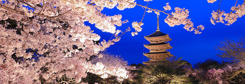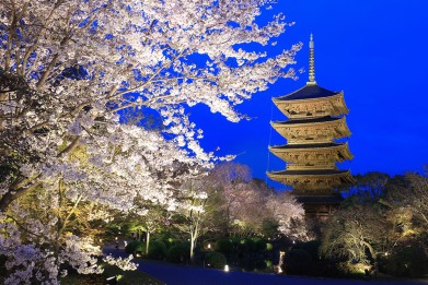 京都のランドマークともいえる五重塔(国宝)を有する東寺。境内に咲き誇る約200本のソメイヨシノがライトアップされ、五重塔を背景に「これぞ京都!」な春景色が広がります。夜桜だけでなく、金堂・講堂の夜間拝観も楽しめます。