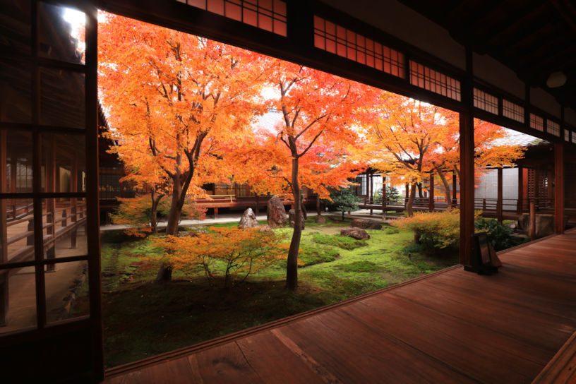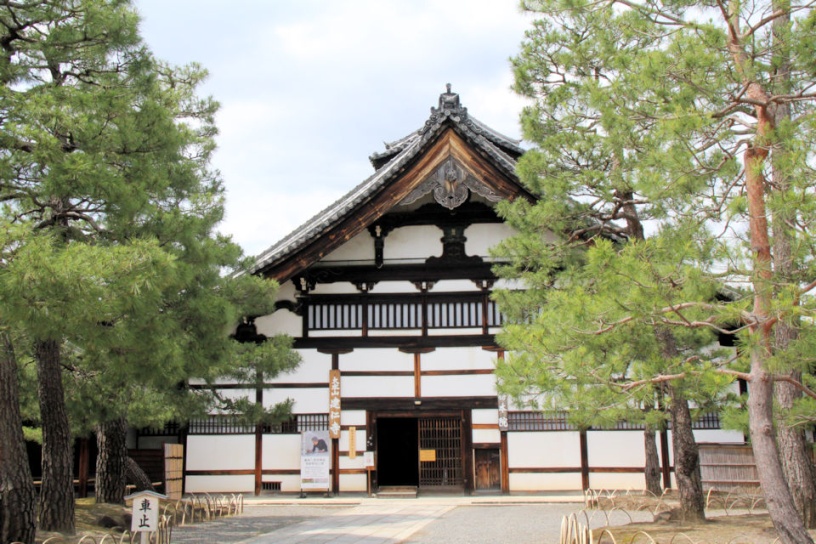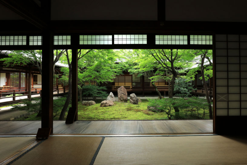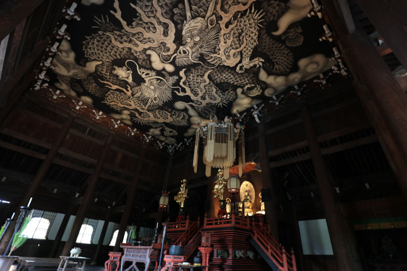 京都最古の禅寺であり、臨済宗建仁寺派の大本山。宋で禅を学んだ栄西が、建仁2年(1202)、中国の百丈山を模して建立した。勅使門を正面に、三門、法堂、方丈が一直線に並び、禅修行のひとつである浴室も現存している。方丈は慶長4年(1599)、安芸の安国寺から移築した優美なこけら葺きの建物。本尊は法堂の釈迦如来。大雄苑という枯山水の庭が美しい。海北友松の襖絵も所有。法堂の天井に描かれた「双龍図」も見どころ。