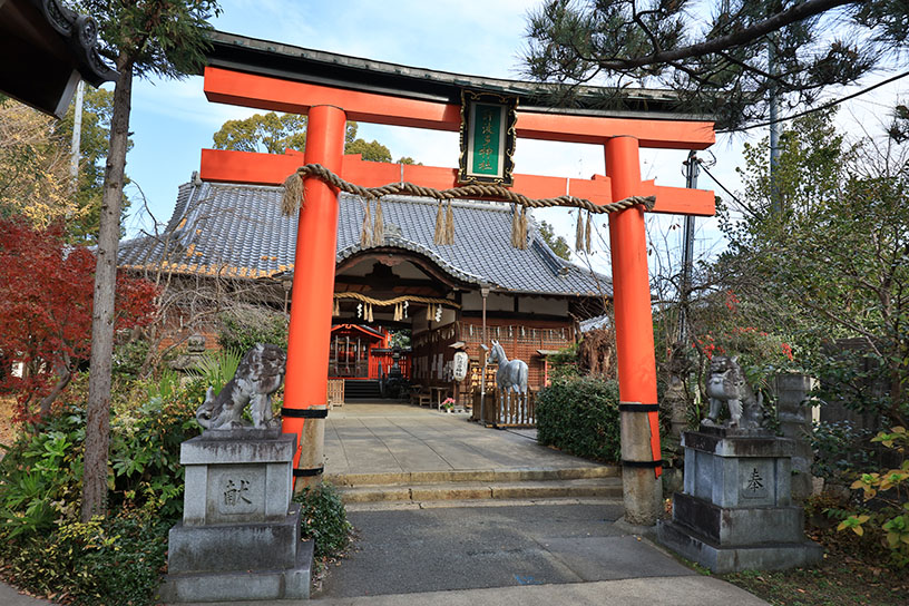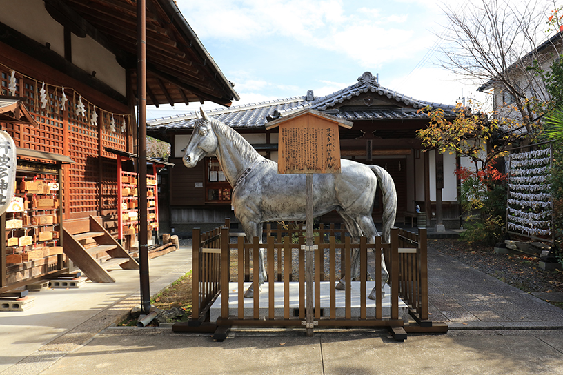 大化元年(645)に創建された古社。大海人皇子(後の天武天皇)や征夷大将軍 坂上田村麻呂が戦勝を祈願したと伝わることから、勝運を授かる神社として信仰されている。明治時代に国により現在地へ移転。それ以前は柳山に広大な境内地を有し、東西2町の馬場道で南北氏子の神馬による祭礼が行われていた。同社には平安期の馬頭天王神像や、わが国現存唯一の鐙(あぶみ・重文)が伝わることもあり、「馬にまつわる神様」としても親しまれている。また、近年は、宇治市を舞台にした人気アニメの登場人物の家のモデルとなり、参拝に訪れるファンも多い。
