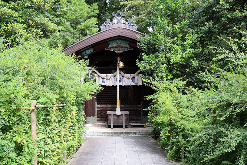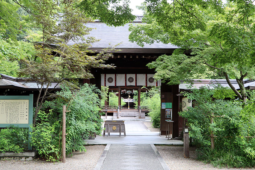 明治18年(1885)に三條実万公を祭神として創建され、大正4年に嗣子・三條実美公を合祀された。両公は明治維新に功績を残し、知と行動を兼ね備えた学問の神様として信仰されている。江戸時代後期の国学者である上田秋成や、ノーベル賞受賞者の湯川秀樹の歌碑がある。木立に囲まれた閑静な境内には、京都三名水のひとつといわれる「染井の水」を拝する。秋には萩や紅葉の名所として知られている。