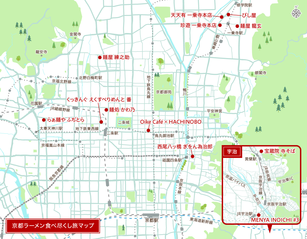 京都の中でも一乗寺エリアは、有名店がしのぎを削るラーメン激戦区。叡山電鉄「一乗寺駅」から徒歩圏内に、およそ20軒ものラーメン店が軒を連ねる光景は圧巻です。地元の人はもちろん、全国からやってくるラーメン好きにも愛されるスポット。近隣に大学が多い「学生の街」ということもあり、ボリュームたっぷりのこってり系京都ラーメンが人気です。京都でラーメンを食べるならまずは一乗寺へ。