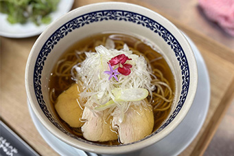 中華料理20年、精進料理7年の経歴を持つ店主が火曜・木曜・土曜のモーニング限定で提供する「朝ラーメン」。だしソムリエの経験を活かし、スープは魚介と昆布のあっさり出汁がベース。手打ち麺や、ローズヒップに3日間漬け込みオーブンで焼き上げたチャーシューなど、独創的な一杯。