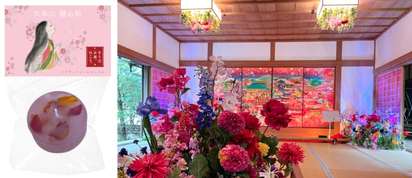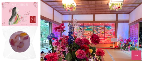 「能の間」を彩る襖絵「極彩色梅匂小町絵図」と花々との共演をお楽しみください。
