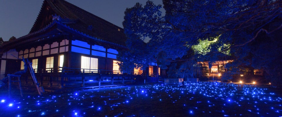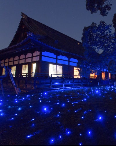 今回の「そうだ 京都、行こう。」キャンペーンCMの舞台の一つである「青蓮院門跡」にて、夜の特別ライトアップイベントを開催します。日中とは異なる静けさのなか、幻想的に浮かび上がる青もみじや境内の風景など、夏の京都ならではの特別なひとときをお楽しみください。