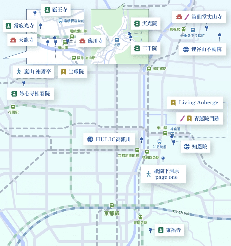 三千院、実光院、常寂光寺、祇王寺、妙心寺桂春院、東福寺(本坊庭園)